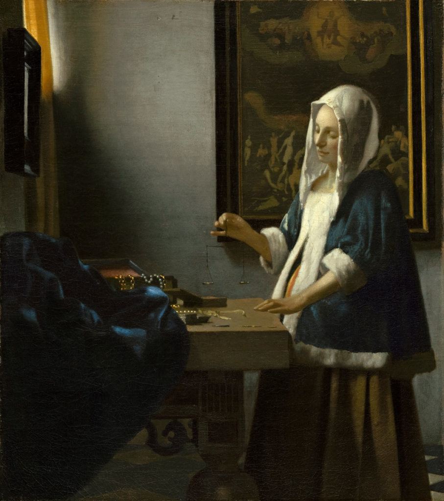 A woman dressed in a blue jacket with fur trim stands alone before a table in a corner of a room. She holds a balance in her right hand and …